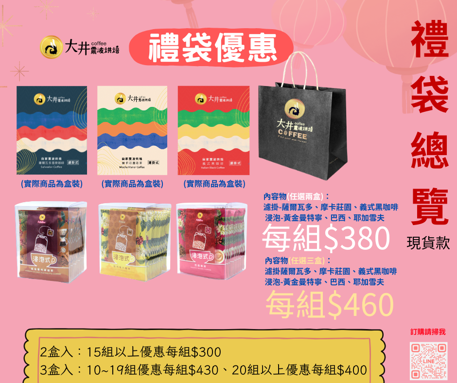 濾掛:薩爾瓦多、摩卡莊園、義式浸泡:巴西、黃金曼特寧、耶加雪夫以上六款選2盒-- 每組 $38015組(含)以上每組$300※如有指定商品可以備註唷,無備註會隨機出貨。...